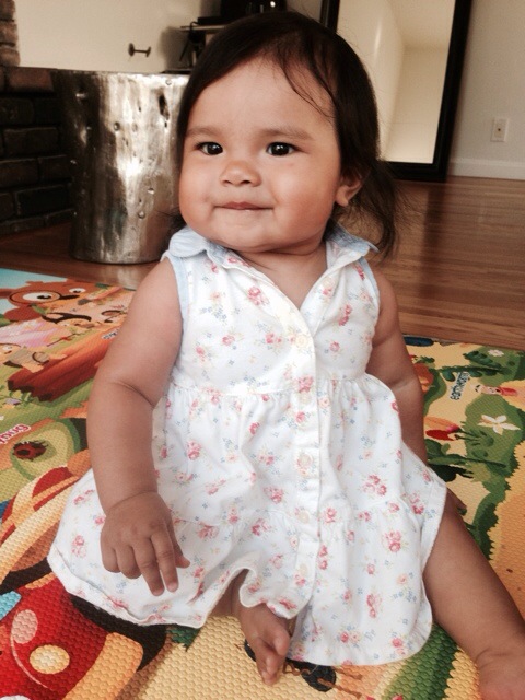 You are 7.5 months, you have two bottom front teeth, top canine teeth are popping through, you enjoy swimming, dancing, laughing and smiling!
